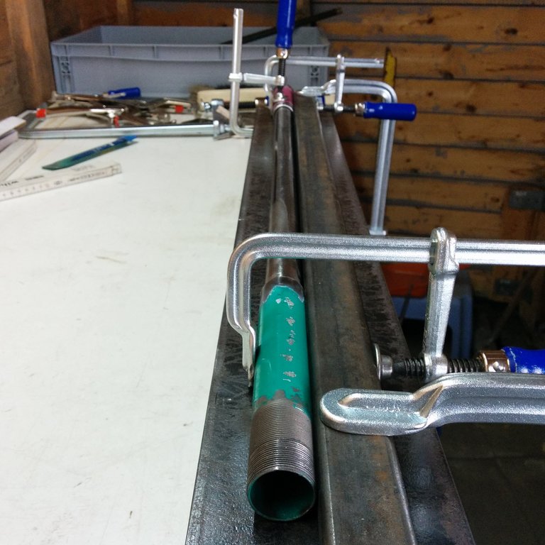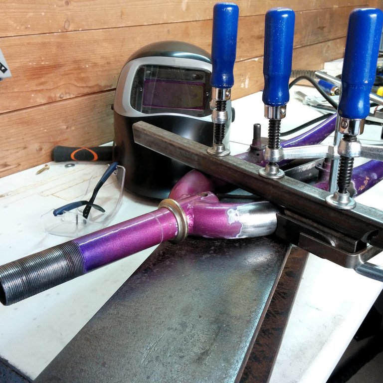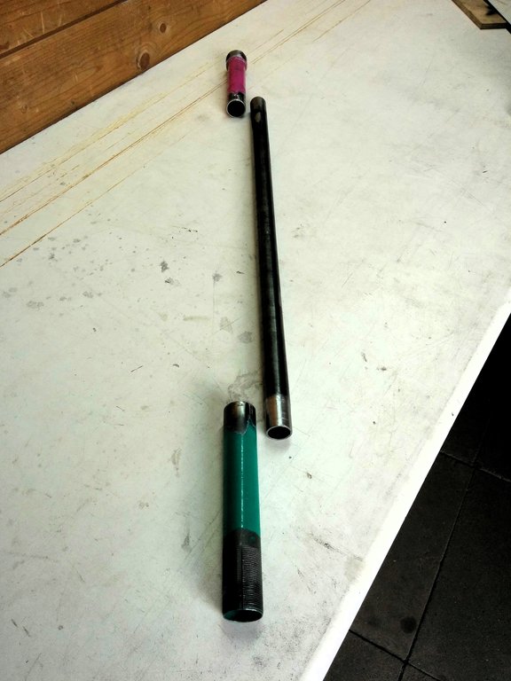 Für die Lenkung dienen zwei 1-Zoll-Gabeln als Gabelschaftspender (oben fürs Gewinde (grün), unten zum Aufpressen des Gabelkonus (pink)), in die Mitte kommt ein ½”-Rohr (Außendurchmesser 21,3 mm). An das ganze kommt oben der Lenker, unten der hintere Lenkhebel.